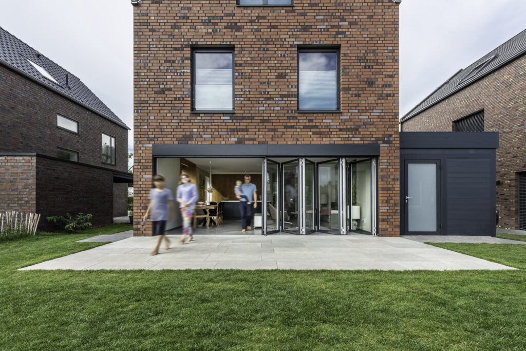 Der Neubau fügt sich optisch in das Wohngebiet ein: rechteckige Grundfläche, Satteldach und Klinkerfassade waren vorgegeben – und dennoch ist ein unverwechselbares Zuhause entstanden. Neben der Glas-Faltwand schaffen raumhohe Türen, warme Holzelemente und ein großes Sitzfenster eine offene, freundliche Atmosphäre. Dank hochwertiger Wärmedämmung erfüllt die Verglasung mühelos die Vorgaben der Energieeinsparverordnung (EnEV).