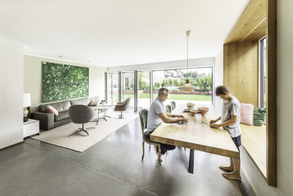 Der offene Grundriss schafft Raum für Begegnungen. Ob beim Frühstück mit Blick ins Grüne, beim gemeinsamen Spielen oder beim geselligen Abend mit Freund*innen. Besonders an warmen Tagen wird der Wohnbereich fast täglich erweitert: „Wenn alles geöffnet ist, fühlt es sich an, als würden wir draußen wohnen“, erzählen die Hermanns. Die große Familienrunde findet hier ebenso Platz wie spontane Nachbarschaftstreffen oder Fußballabende im Garten.