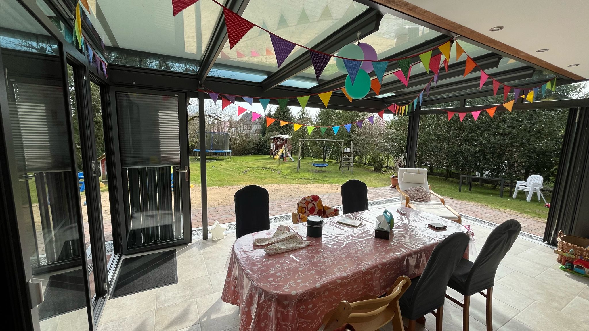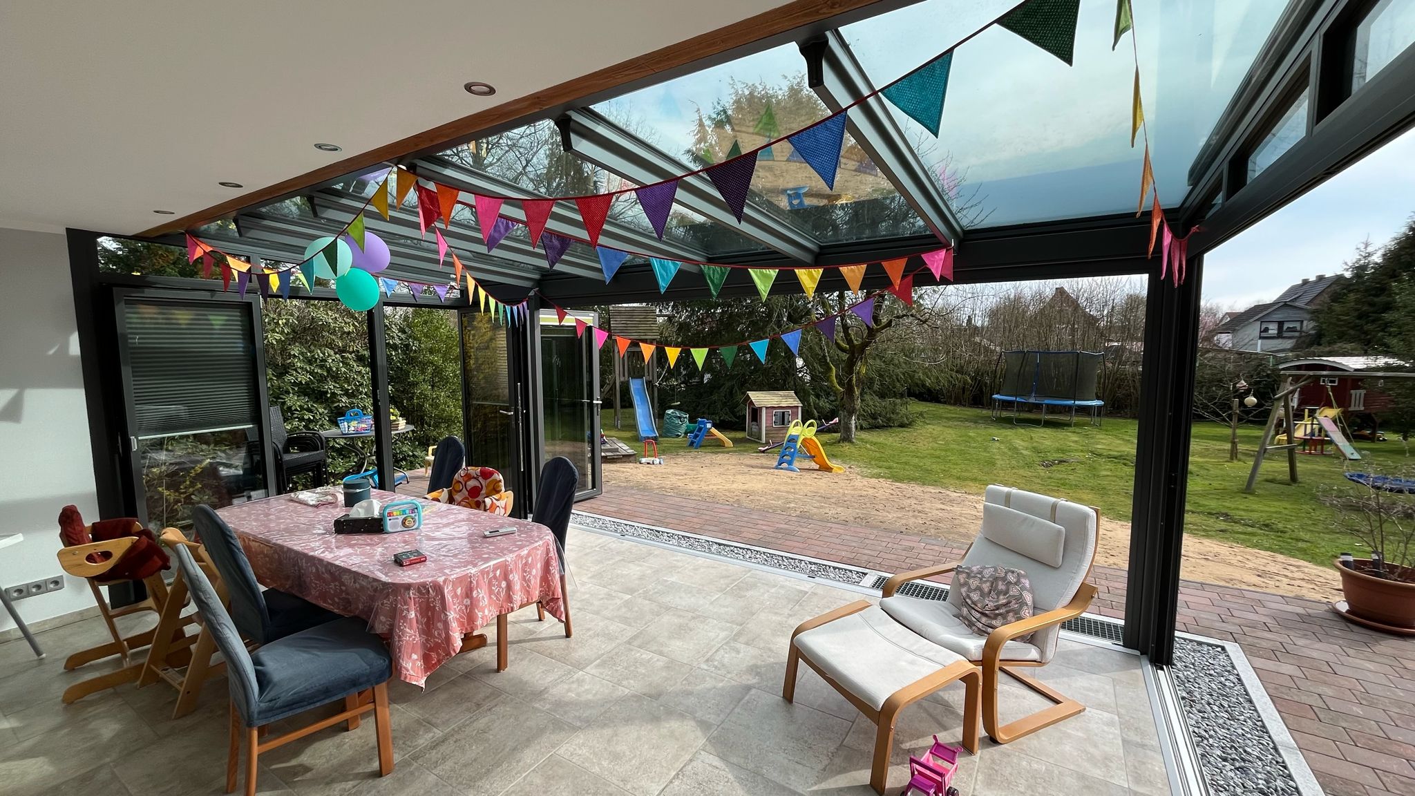 Die Familie aus Celle hat sich für den Warmwintergarten Nobiles von Solarlux entschieden. Die innenliegende Statik und der minimale Aufbau der Design-Sparren verwirklichen von außen eine ebene Dachfläche und verleihen dem System eine nahezu schwebende Konstruktion. Die großflächige Öffnung des Wintergartens wird durch zwei 6- und 3-flügelige Glas-Faltwände „Highline“ ermöglicht. Das Wohnzimmer kann durch das transparentes Schiebe-Dreh Systeme Proline T von Solarlux ebenfalls völlig flexibel geschlossen oder geöffnet werden. Beschattet wird der Wintergarten von einer Weinor WGM TOP OptiStretch voll automatisch gesteuert über einen Sonne-Wind-Sensor.