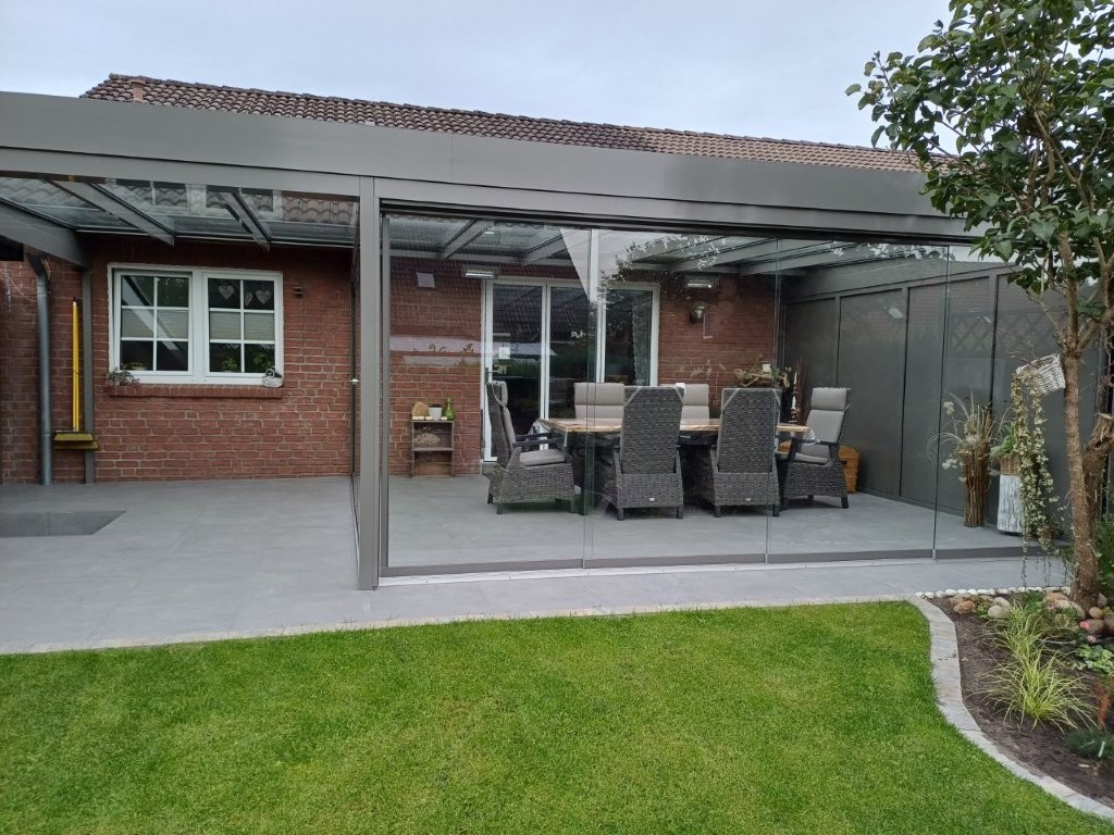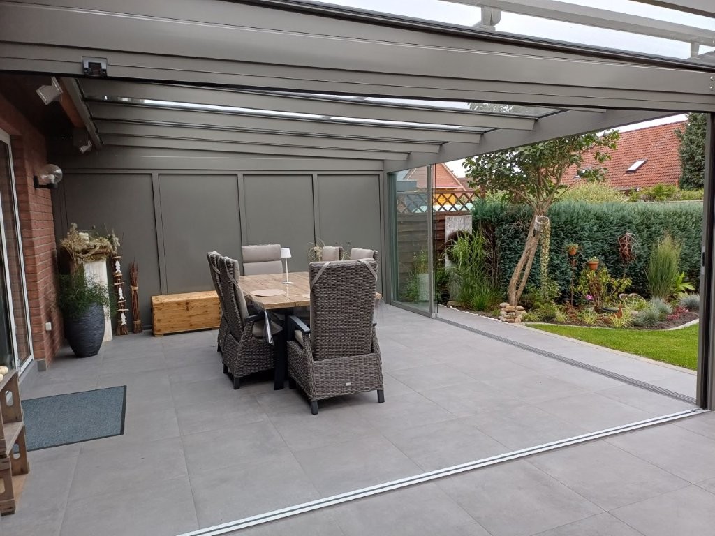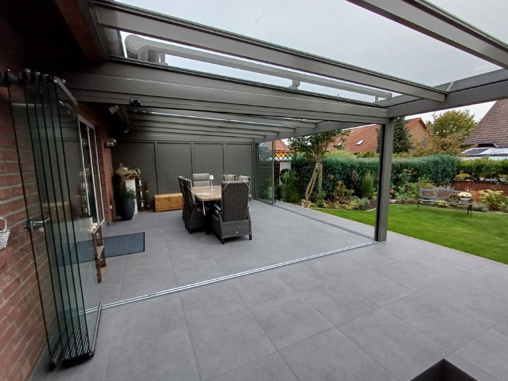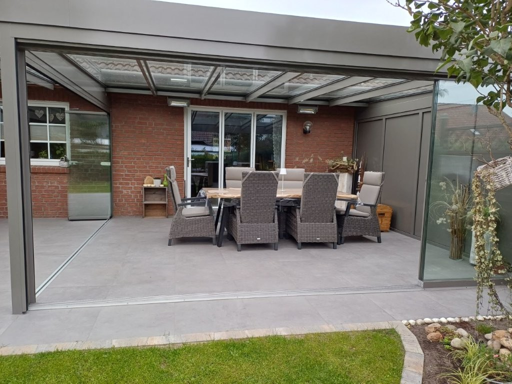 Die Wahl fiel auf das großes Terrassendach ACUBIS von Solarlux, welches mit seinen 32 m² die gesamte neu gepflasterte Terrasse überspannt. Bei kühleren Temperaturen sorgen 6 Schiebe-Dreh-Elemente auf der rechten Seite (PROLINE T) und 4 Schiebe-Elemente (PROLINE S) vorne für die flexible Verwandlung in ein geschütztes Glashaus. Die Bodenschienen sind dabei barrierefrei in den Fußboden eingelassen. Das 4-teiliger Aluminium-Fenster mit Alu-Füllung passt perfekt und dient als Sichtschutz. Abgerundet wird das Konzept durch eine Senkrecht-Markise vorne und eine Aufdachmarkise über dem Glashaus.